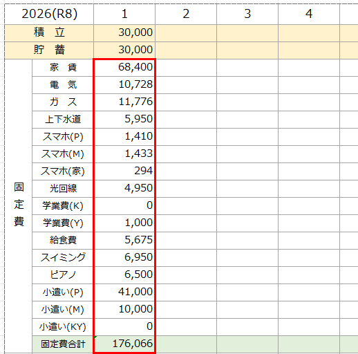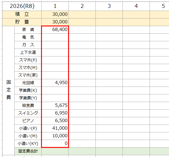 固定費の項目のなかで、家賃や習い事費などの毎月決まった金額のものは毎月1日に記入します。