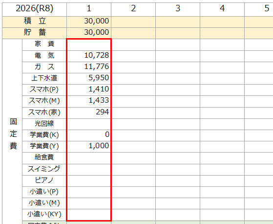 固定費の項目のなかで、電気代や学業費などの毎月金額が変動するものは決まった時点で記入します。