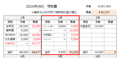 | 特別費 | 毎月ではなく1度の支出金額が大きい支出、突発的な支出 | 自動車税、年会費、イベント費 |